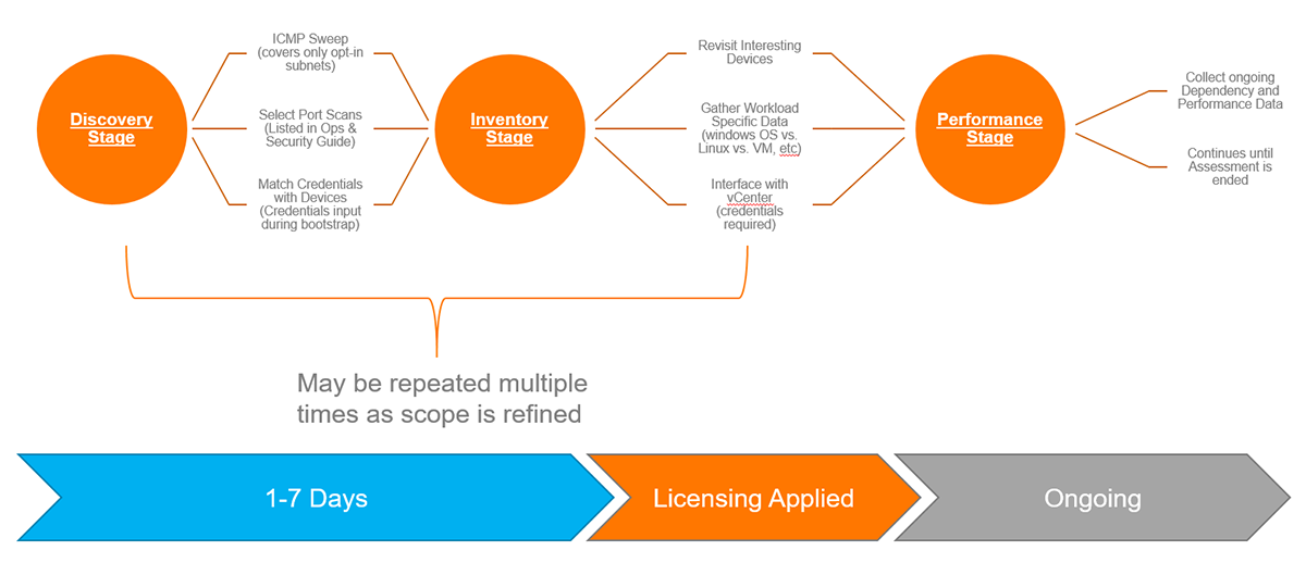 Inventory StageDuring this stage the appliance revisits those “Interesting Devices” determined during the Discovery Stage using the matched credentials to gather workload specific data. All workload specific data is then compressed, encrypted, and uploaded via a secure SSL connection to the RISC Networks’ SCE. At the end of the inventory phase a populated asset report and licensing page will be available in the RISC Networks portal. The user can then select devices within the licensing page that will move on to the Performance Stage. This ends the Inventory Stage.